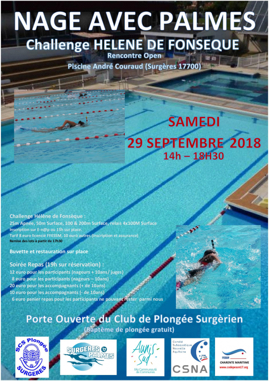 Challenge Hélène de FonséqueLe Challenge HELENE de FONSEQUE du Sporting Club de Surgères -Plongée est une rencontre amicale de Nage avec Palmes en Piscine Découverte, ouverte à tous les clubs ayant constitué au moins une équipe de QUATRE nageurs ou ayant des nageurs individuels souhaitant intégrer ou non une équipe, et ouvert à tout nageur, de notre Fédération ou autre, voulant se mesurer à des compétiteurs.